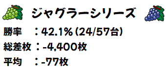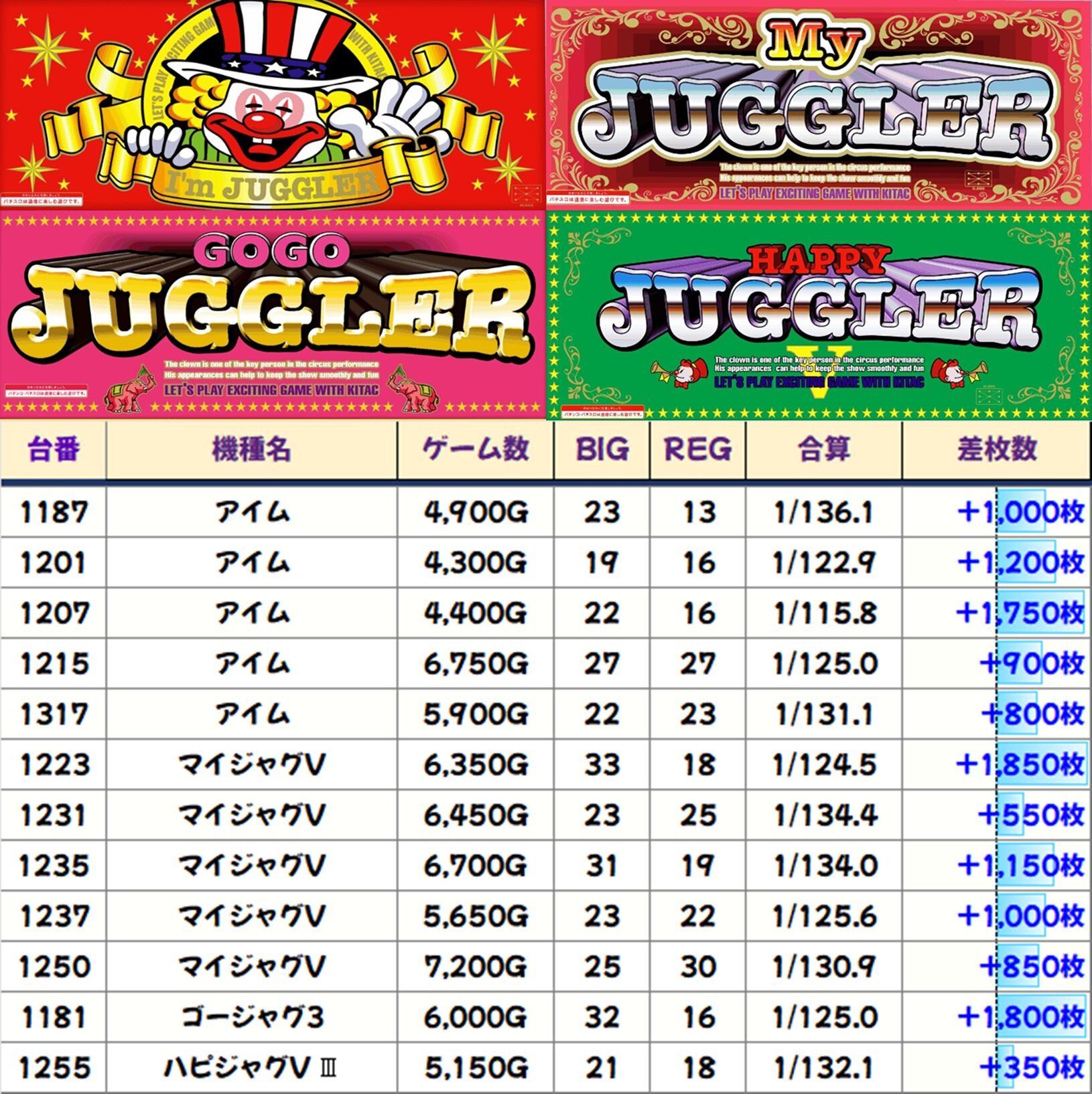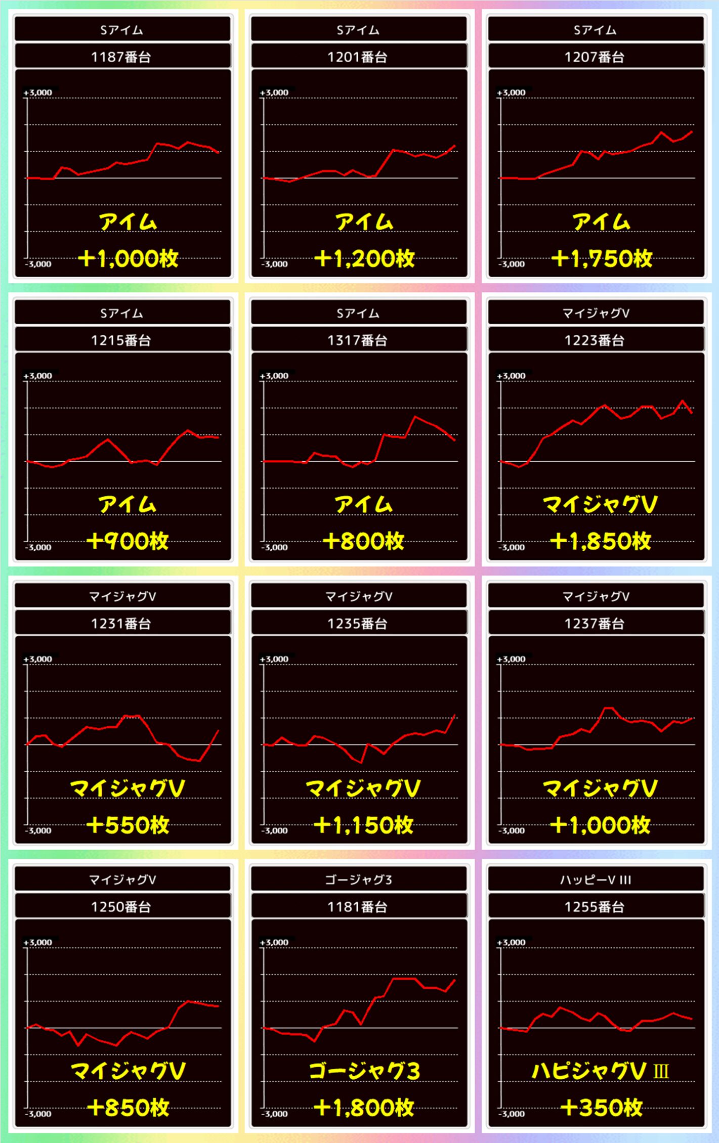 SAP蒲生のジャグラーシリーズも高配分。「マイジャグV」の+1,850枚、「ゴージャグ3」の+1,800枚など本日は+1,000枚以上の台が7台出現しました。