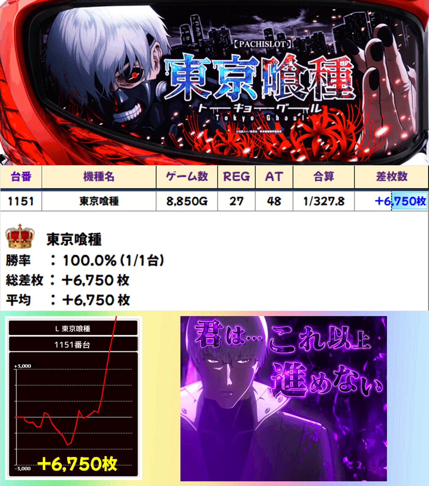 SAPみずほ台の「東京喰種」は+6,750枚で大勝利! 高設定とヒキがしっかり噛み合いましたね。