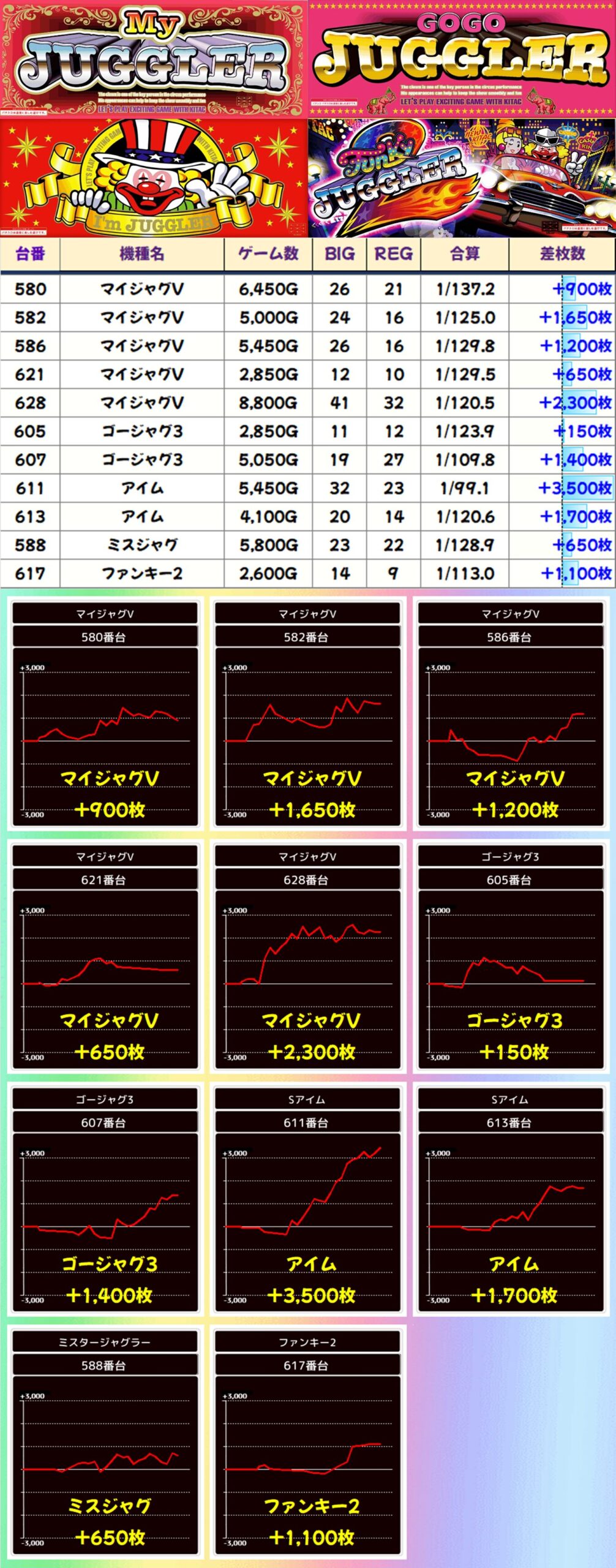 SAP北野のジャグラーシリーズは「ジャグラーガールズ」が全台系濃厚! その他のジャグラーにも高設定が散りばめられていたので各機種から優秀台が多数出現しました。