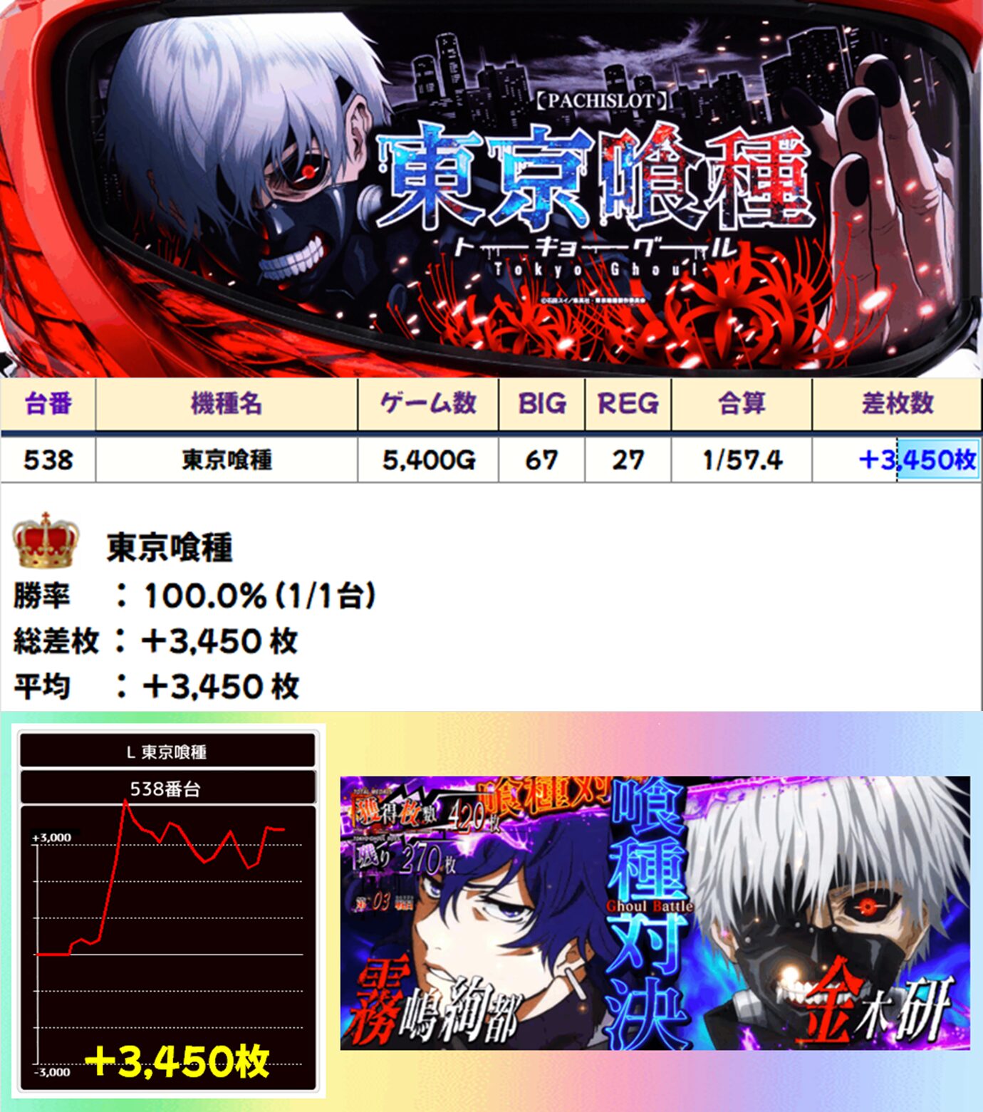 SAP北野の「東京喰種」ももちろんお宝台の挙動! 3,000枚を超える出玉を獲得し、楽々勝利を収めました。