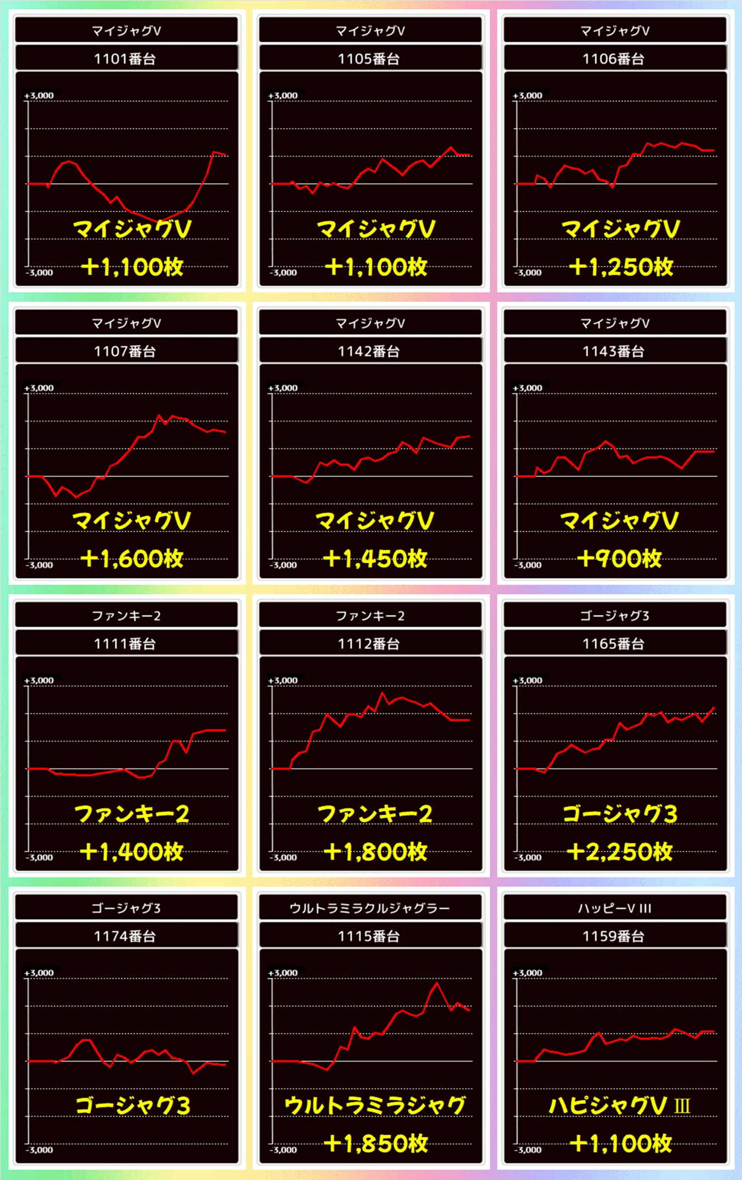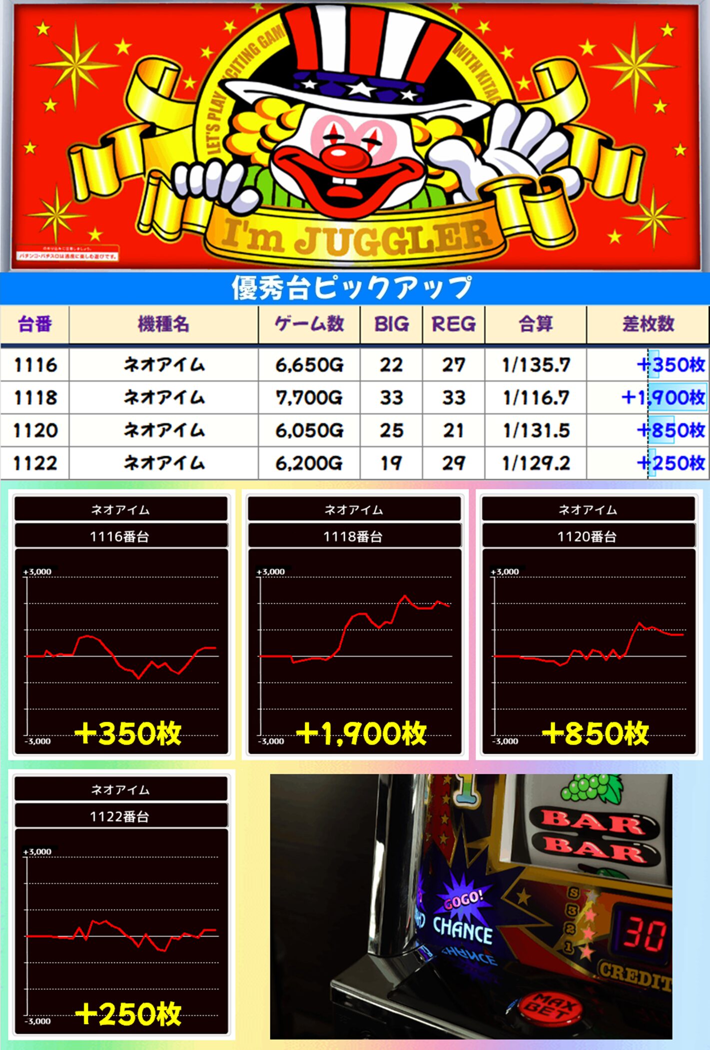 SAP立川のジャグラーシリーズは「アイム」と「ネオアイム」が高配分。 その他のジャグラーからも+1,000枚以上の優秀台が多数出現しました。