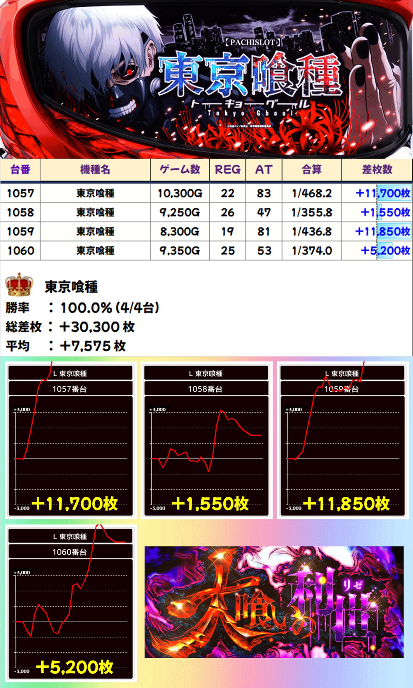 SAP立川の「東京喰種」の結果は総差枚+30,300枚、平均差枚+7,575枚で全台がプラス差枚。+11,850枚、+11,700枚、+5,200枚と3台が大爆発し、大いに盛り上がりました!